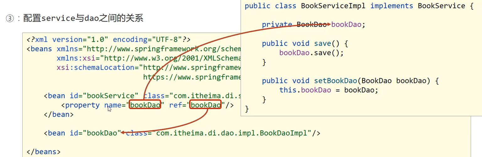 - 在容器中建立bean与bean之间的依赖关系的整个过程,称为依赖注入。